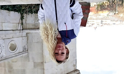 Hot busty girl with massive honkers sees the guy having sex, starts masturbating and then offers her figure to him, once he is ended