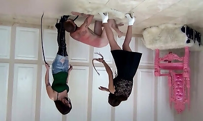 Two girls whipping male slave