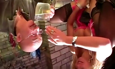 Super-sexy Busty Blonde Cougar Milks the Dangled Cock Of Her Sex-slave, Making Him Cum In His Own Mouth