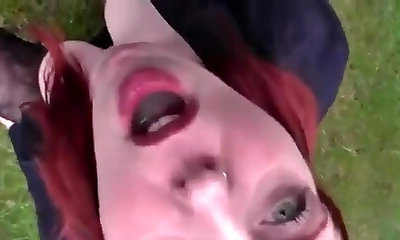couguar allemand aux cheveux roux travaille cette grosse bite avec son cul et ses mâchoires dans le parc